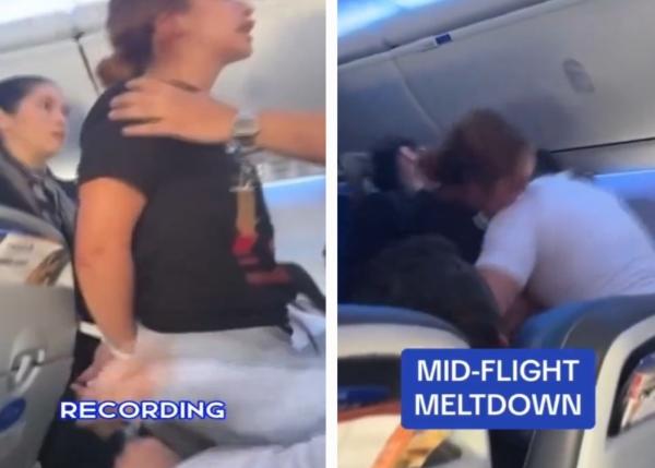 إذ بدأت الراكبة الغاضبة بالصراخ على الآخرين بينما حاولت الطواقم السيطرة عليها باستخدام الأصفاد البلاستيكية.