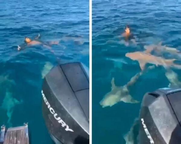 وانتشر مقطع فيديو وظهر الشاب في بداية مقطع الفيديو يسبح على ظهره في الماء، حينما اقتربت مجموعة من أسماك القرش منه، ليظهر الشاب ردة فعل هادئة جدا، حيث استخدم حركات بسيطة بيديه لإبعاد أسماك القرش عنه والحفاظ على مسافة آمنة، ثم صعد على الفور على مركبه.