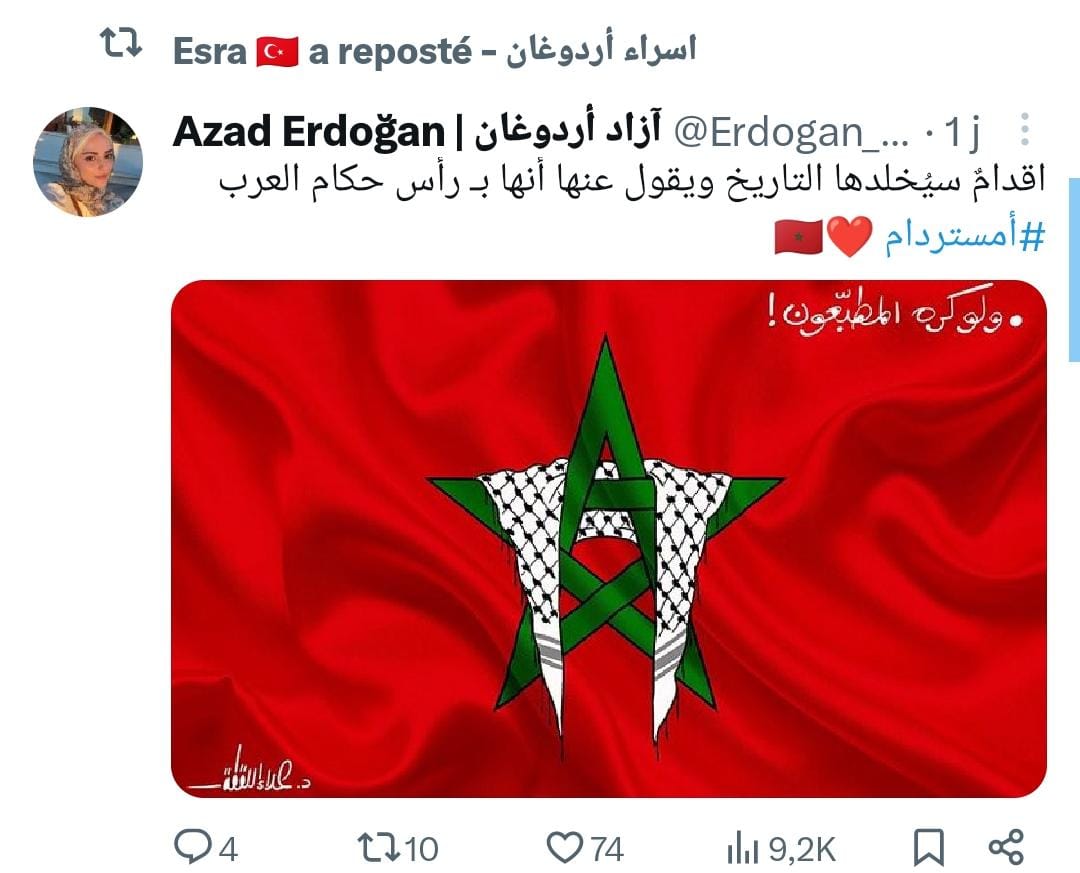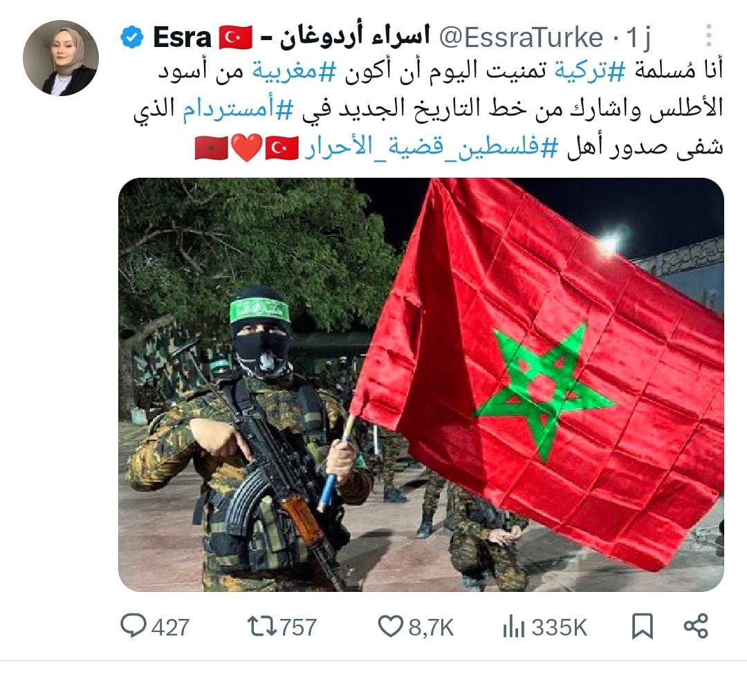 أثنت الناشطة الحقوقية التركية، إسراء أردوغان، على الدور البارز للمغاربة في الدفاع عن القضية الفلسطينية، واصفة إياهم بـ"أسود الأطلس"، كما أعربت عن رغبتها في أن تكون مغربية تقديرًا لشجاعتهم وتماسكهم.