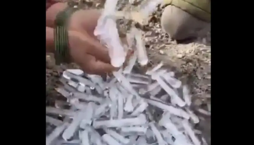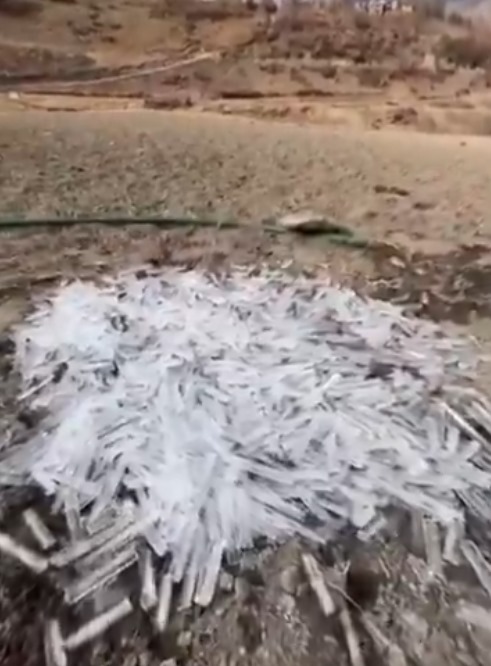 ويُظهر أحد المقاطع رجلاً يحاول إخراج المياه من أنبوب ري موصول بالصنبور، حيث خرجت المياه على شكل قطع جليدية طويلة تصدر أصواتًا شبيهة بالزجاج، في مشهد يعكس شدة برودة الطقس في المنطقة.