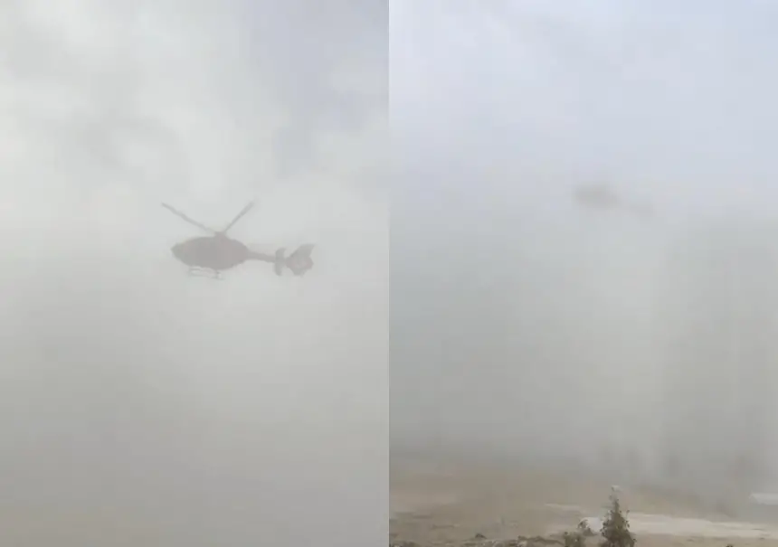ويظهر في الفيديو بأن الجو كان ضبابيا وقت إقلاع المروحية التي لم تتمكن من الهبوط في المستشفى.