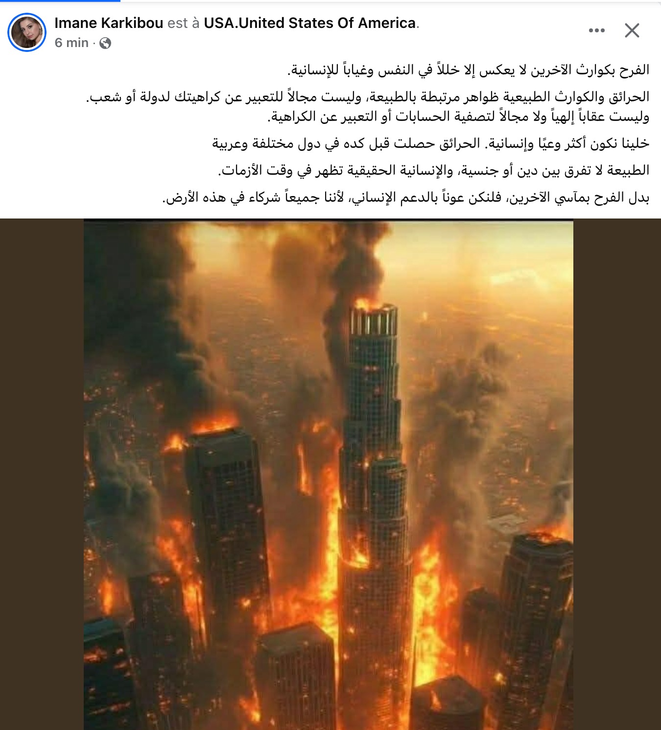 من جانبها، عبرت الفنانة المغربية "إيمان قرقيبو" المتواجدة حاليا بأمريكا، عن أسفها الشديد لفرح فئات عريضة من المسلمين، للدمار الذي لحق مناطق شاسعة من ولاية كاليفورنيا، حيث نشرت بالمناسبة تدوينة عبر حسابها الفيسبوكي، أكدت من خلالها أن "الفرح بكوارث الآخرين لا يعكس إلا خللاً في النفس وغياباً للإنسانية".