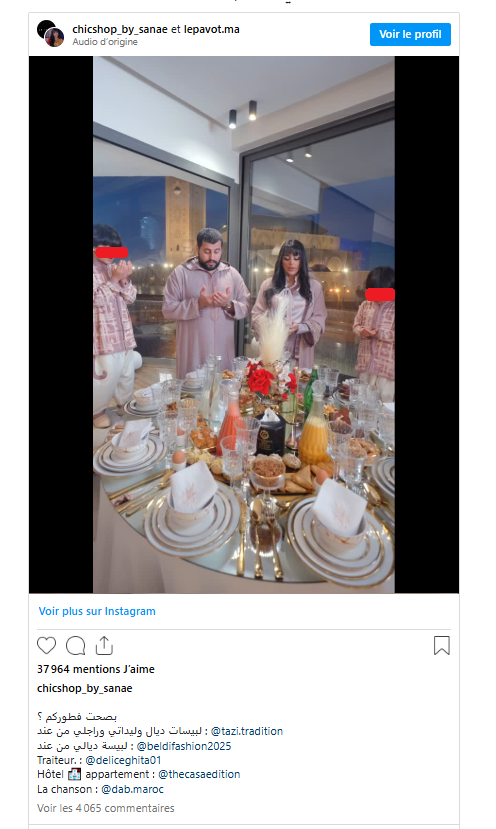 وفي السياق ذاته، أثار مقطع فيديو نشرته مؤثرة مغربية معروفة تدعى "سناء" جدلًا واسعًا، حيث ظهرت مع أفراد أسرتها مرتدين أزياء فاخرة، في غرفة طعام ذات ديكور فاخر، وهم جالسون حول مائدة إفطار تضم أطباقًا متنوعة، والتي يتم تقديمها على يد "خادم". وهو ما دفع المعلقين على المقطع ذاته للتساؤل: متى كان المغاربة يفطرون بهذه الطريقة في منازلهم؟!