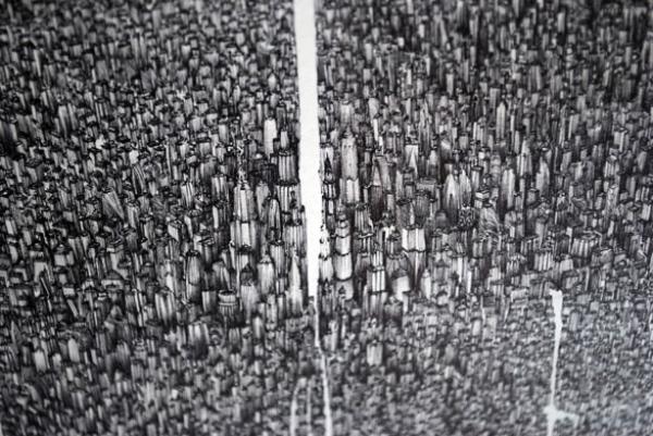 ويستخدم ساك قلم حبر فقط، وما إن ينتهي حتى يبدأ بآخر، وهكذا يعيش حالة محمومة تتجلى في لوحاته الكثيفة التفاصيل، كرسام يجد عالماً كاملاً.