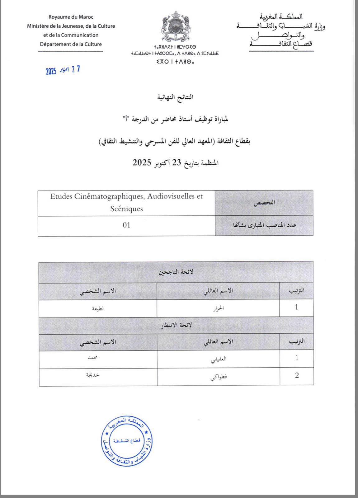 وأكدت المصادر ذاتها أن المباراة نُظمت بإشراف مباشر من وزارة الشباب والثقافة والتواصل – قطاع الثقافة، وليس من طرف إدارة المعهد العالي للفن المسرحي والتنشيط الثقافي، وهو ما يجعل أي تشكيك في نتائجها تشكيكًا في مصداقية الوزارة نفسها، التي سهرت على احترام جميع الضوابط القانونية والتنظيمية المعمول بها.