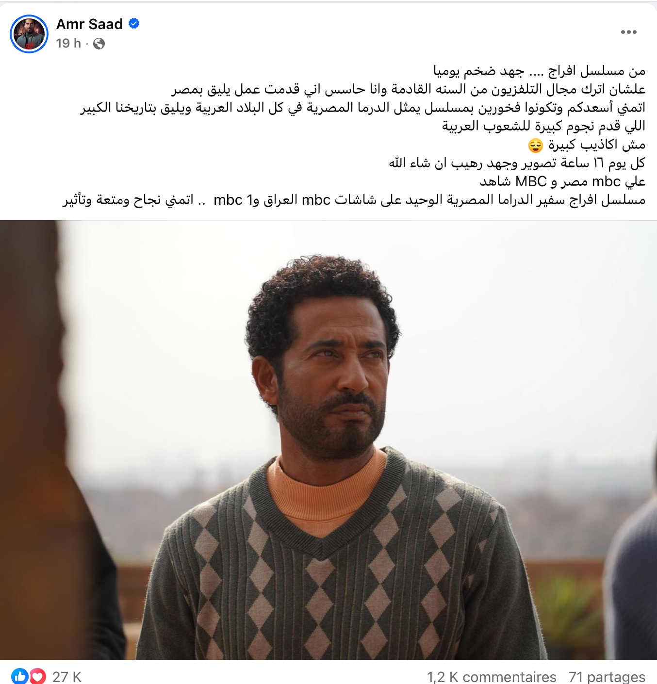 وجاء في تدوينة "عمرو سعد": "من مسلسل إفراج … جهد ضخم يومياً، علشان أترك مجال التلفزيون من السنة القادمة وانا حاسس اني قدمت عمل يليق بمصر"، وتابع قائلا: "أتمنى أسعدكم وتكونوا فخورين بمسلسل يمثل الدراما المصرية في كل البلاد العربية و يليق بتاريخنا الكبير اللي قدم نجوم كبيرة للشعوب العربية.. مش أكاذيب كبيرة"، قبل يؤكد بالقول: "كل يوم 16 ساعة تصوير وجهد رهيب إن شاء الله على MBC مصر وMBC شاهد، مسلسل إفراج سفير الدراما المصرية الوحيد على شاشات MBC العراق وMBC 1 .. أتمنى نجاح ومتعة وتأثير".