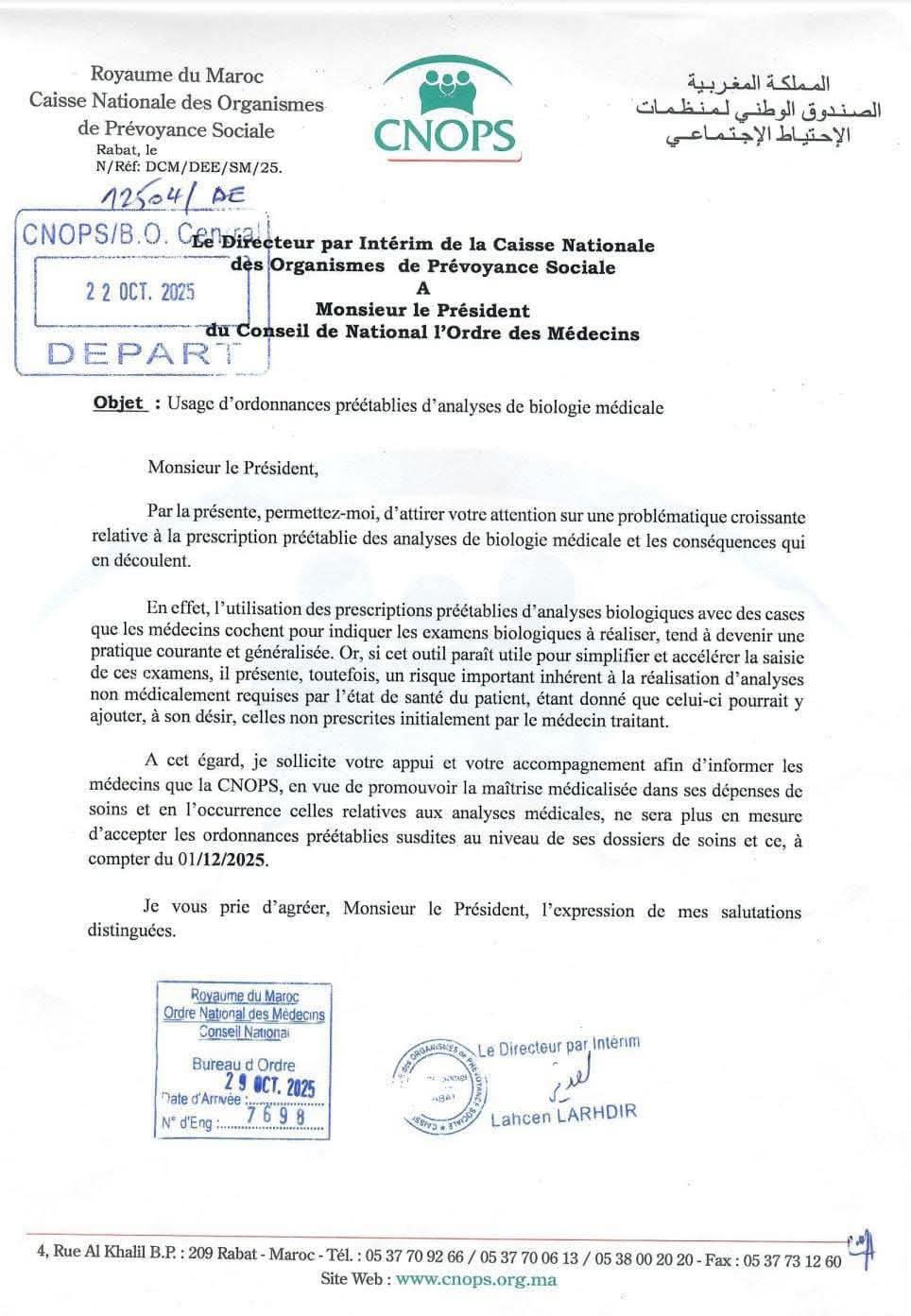 وجاء قرار “كنوبس” بناء على مراسلة رسمية وجهها مديرها بالنيابة إلى رئيس المجلس الوطني لهيئة الأطباء، يطلب فيها إبلاغ المهنيين بكون الصندوق لن يقبل، ابتداء من فاتح دجنبر المقبل، أي ملف تعويض يعتمد على وصفة طبية جاهزة تتضمن خانات للتحاليل الطبية يسهل على الطبيب أو حتى المريض إضافتها دون تقييم طبي دقيق، حيث أكدت المراسلة أن هذا النمط من الوصفات، وإن بدا في ظاهره وسيلة لتسريع الإجراءات، إلا أنه يطرح إشكاليات حقيقية تتعلق بإجراء تحاليل غير لازمة طبيا، وهو ما يثقل كلفة العلاجات ويسيء إلى مبدأ ترشيد النفقات الطبية الذي يعمل الصندوق على تكريسه.