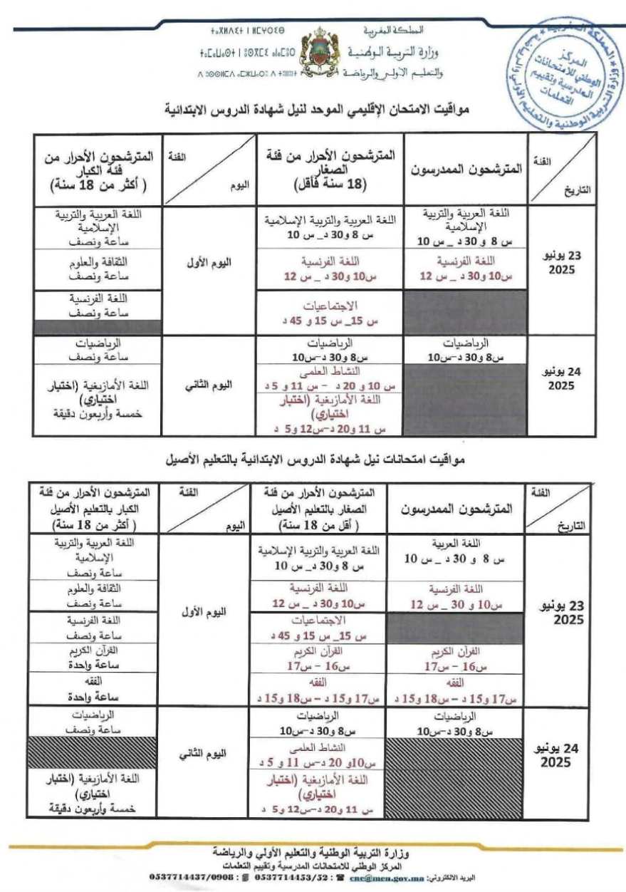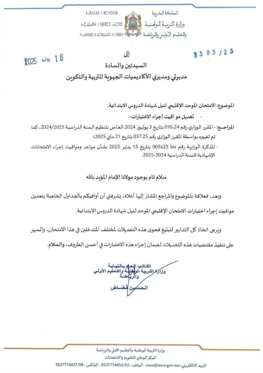 أعلنت وزارة التربية الوطنية والتعليم الأولي والرياضة عن تعديل في برمجة الامتحان الإقليمي لنيل شهادة الدروس الابتدائية، يهم مادة اللغة الفرنسية الخاصة بالمترشحين الممدرسين، وذلك عبر مذكرة رسمية صدرت بتاريخ 18 يونيو الجاري.