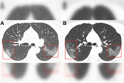 وبعد ثلاثة أيام من العلاج، اتسعت رقعة المنطقة المصابة من الرئتين (الصورة ب) - في الصور تبدو معتمة.