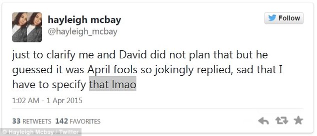 لكن دافيد لم يتمادى كثيراً في الكذب، وكشف لخطيبته أنه كان يمازحها، وبعد أن عادت الأمور إلى مجاريها بينهما، قررت هايلي أن تنشر المحادثة على حسابها في تويتر تحت عنوان :"كذبة أبريل التي انقلبت ضدي"، وأعيد نشر التغريدة أكثر من 12 ألف مرة وحصلت على 11 ألف إعجاب على تويتر.