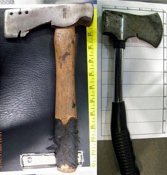 3- فؤوس حديدية وخشبية، يتجاوز طول كل منها الـ7 بوصات.