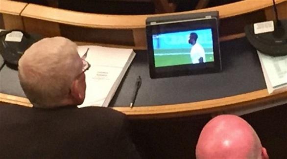 وتابع العضوان المباراة لمدة تراوحت بين 5 و10 دقائق، قبل أن يصيح أحد الحضور طالباً منهما التركيز على الجلسة والتوقف عن مشاهدة كرة القدم.