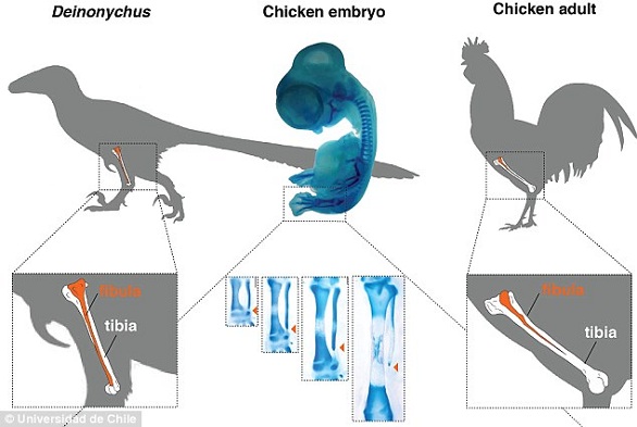 وكان العلماء قد لاحظوا أن طيور الدجاج تبدأ بتطوير عظام شظية أنبوبية تشبه تلك التي كانت لدى الديناصورات، لكنها ما تلبث أن تتحول إلى عظام قصيرة، ولفهم هذا التطور، قام الباحث البرازيلي جواو باتيلو بعكس عملية التطور، ولاحظ أن النهايات السفلى من العظام كانت نشطة في بداية التطور، قبل أن تتوقف عملية النمو وانقسام الخلايا.