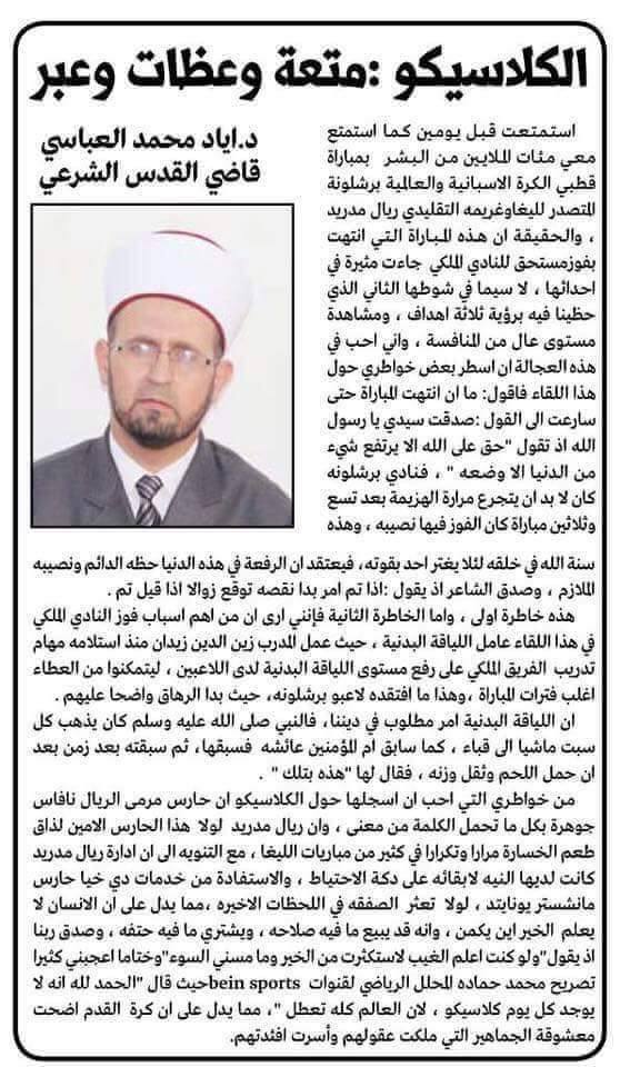 فاجأ قاضي القدس الشرعي د. إياد محمد العباسي قراء زاويته في إحدى الصحف الفلسطينية بتحليل غريب يخلط الرياضة بالدين لمباراة برشلونة وريال مدريد التي جرت منذ أيام.