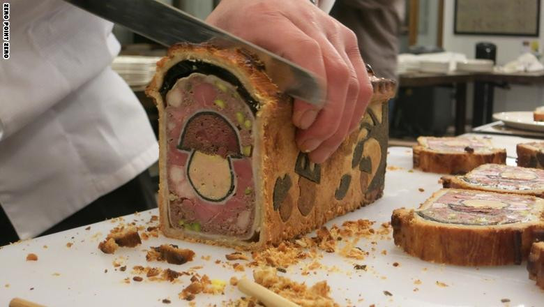 الصورة 10: وضع اللحوم في رغيف خبز: يمكنك تناول طبق “باتيه إن كروت” المشهور في مدينة ليون الفرنسية، وهو عبارة عن لحم داخل رغيف من الخبز.