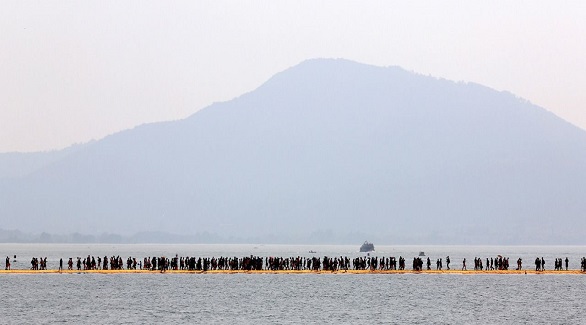 جذب ممر أصفر اللون مصنوع من القماش السميك، ويمتد على سطح بحيرة ليزو في شمال إيطاليا آلاف السياح لعبور البحيرة مشياً وفق ما ورد في موقع ياهو الإلكتروني.