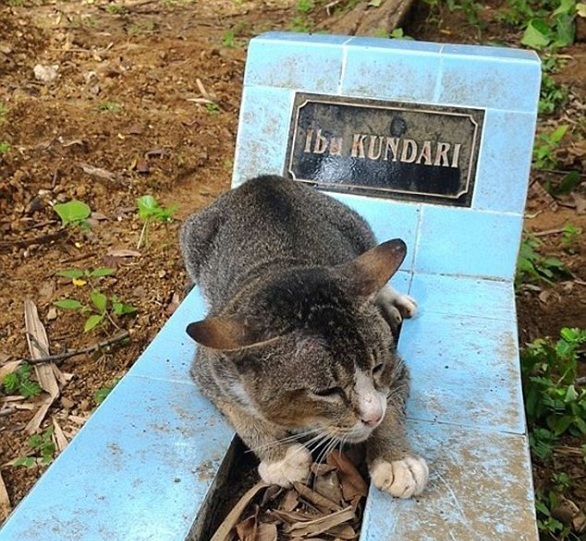 وبعد أن سمع كيلي كيناغاو برايتنو (28 عاماً) بكاء القطة، وهي مستلقية على أرض المقبرة في وسط جاوا بأندونيسيا، قرر أن يتبناها ويحملها إلى منزله، إلا أن القطة الوفية كانت تعود دائماً إلى المقبرة، لتتمرّغ بشاهدة قبر صاحبتها.