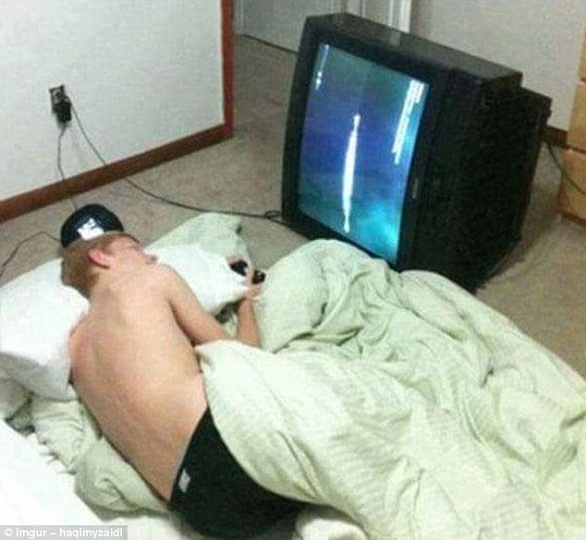 هذا الشاب وجد طريقة طريفة لمتابعة التلفزيون وهو مستلق على الأرض، حيث قام بقلب الجهاز على الجانب، حتى لا يضطر للجلوس أثناء المشاهدة.