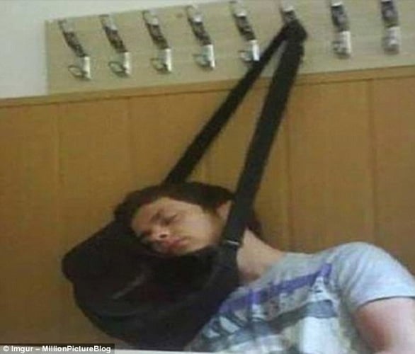 قرر هذا الشاب أن يأخذ غفوة وهو واقف، ولم يجد أفضل من حقيبته ليحولها إلى وسادة ينام عليها.