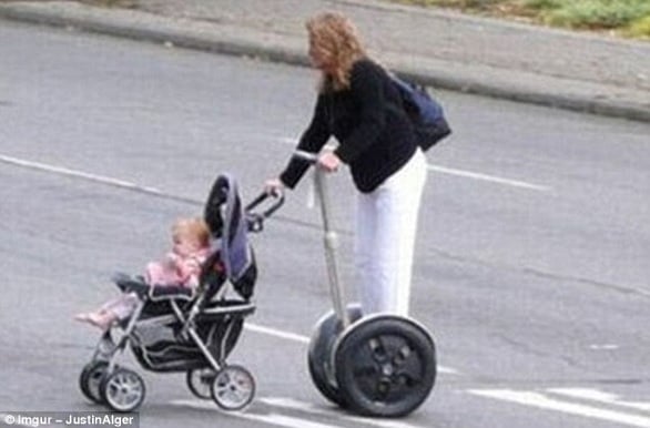 هذه السيدة أرادت أن تشارك طفلتها المتعة، وراحت تجر عربتها وهي تقف على سكوتر تسير لوحدها.