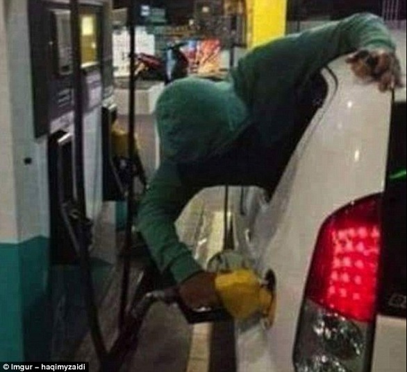 لم يكلف هذا السائق نفسه عناء الخروج من السيارة لتعبئة خزانها بالوقود، بل أطل من النافذة لأداء هذه المهمة.