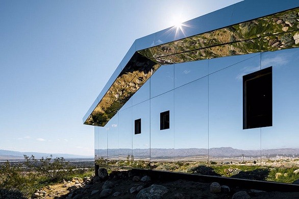 وعندما تنظر إلى المنزل الذي صممه “دوج أتيكان” في صحراء كاليفورنيا، يخيل لك بأنه قطعة من الصحراء، حيث اندمج المنزل بفضل المرايا مع محيطه، وشبهه البعض بالحرباء نظراً لأنه يغير لونه الخارجي خلال اليوم تبعاً للضوء.