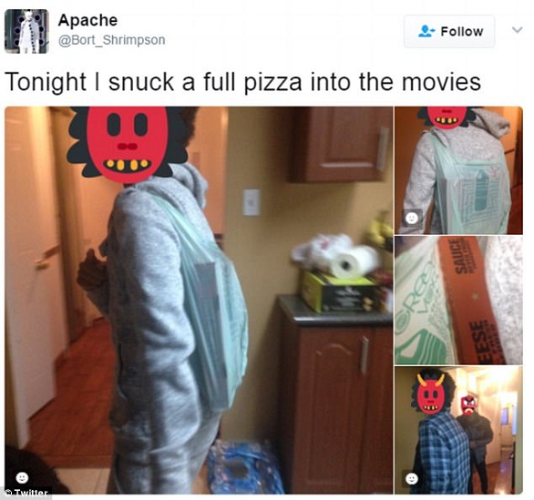 شاب يقوم بتهريب البيتزا خلف ظهره ليتناولها داخل صالة العرض بالسينما.
