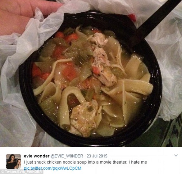 امرأة تقوم بتهريب حساء المعكرونة ولحم الدجاج لتستمتع بوجبتها خلال متابعة الفيلم.