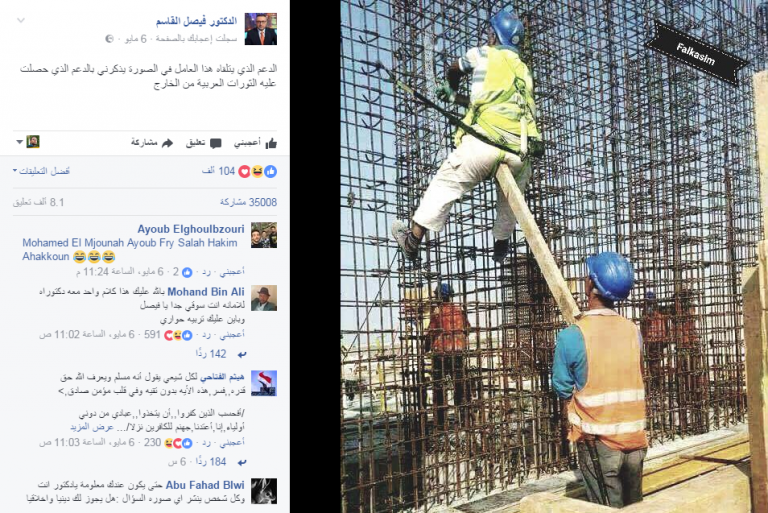 الصورة التي تظهر عامل بناء يتلقى دعما من الأسفل، فيتحول إلى شيء آخر، كتب القاسم تحتها "الدعم الذي يتلقاه هذا العامل في الصورة يذكرني بالدعم الذي حصلت عليه الثورات العربية من الخارج".