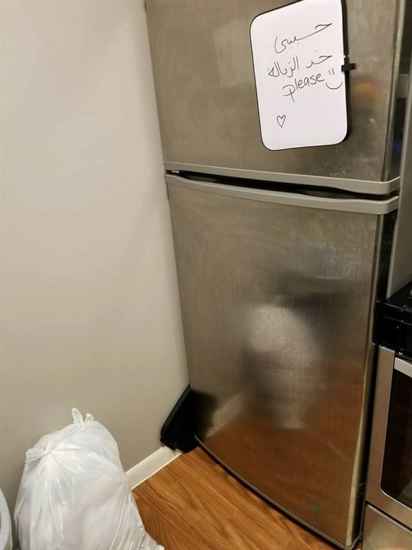 أظهرت الصور المنتشرة عبر مواقع التواصل الاجتماعي "فيس بوك"، امرأة تطلب من زوجها رمي القمامة عند خروجه من المنزل بطريقة طريفة، حيث تركت ورقة ملصقة على الثلاجة وكتبت فيها "حبيبي خد الزبالة رجاء" ورسمت له قلوبا ووجها ضاحكا، وتركت أكياس القمامة بجانب الثلاجة.