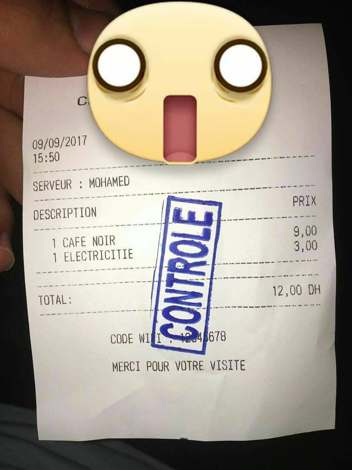 تداولت صفحات فايسبوكية أمس صورة لفاتورة مثيرة للجدل ، حيث قام صاحب مقهى بحي العوامة بطنجة ، باحتساب 3 دراهم مقابل "الكهرباء" فضلا عن ثمن القهوة المحدد في 9 دراهم ليبلغ المجموع 12 درهما .