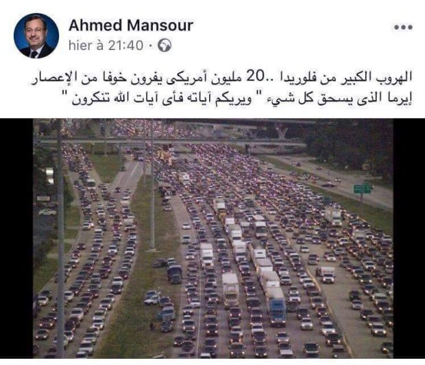 وقال أحمد منصور في تغريدة على حسابه بموقع تويتر للتواصل الإجتماعي “الهروب الكبير من فلوريدا.. 20 مليون أمريكي يفرون خوفًا من الإعصار إيرما الذي يسحق كل شيء مرفقا تدوينته بالآية الكريمة “ويريكم آياته فأي آيات الله تنكرون”.