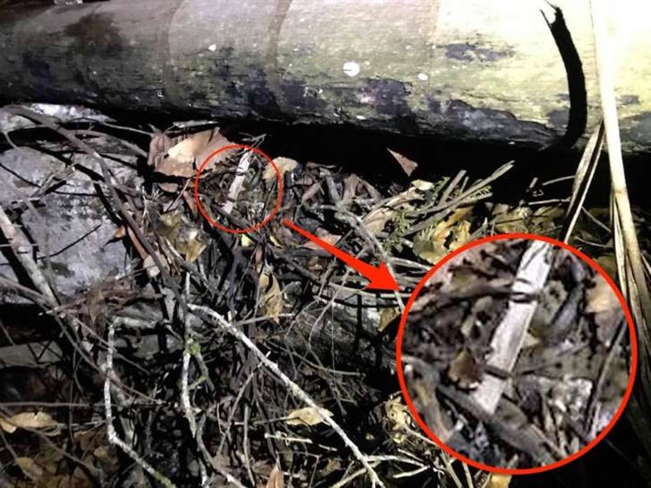 أظهرت الصورة كومة ضخمة من الأوراق المتناثرة والأغصان وفروع الشجر، ما زاد من صعوبة العثور على الأفعى.