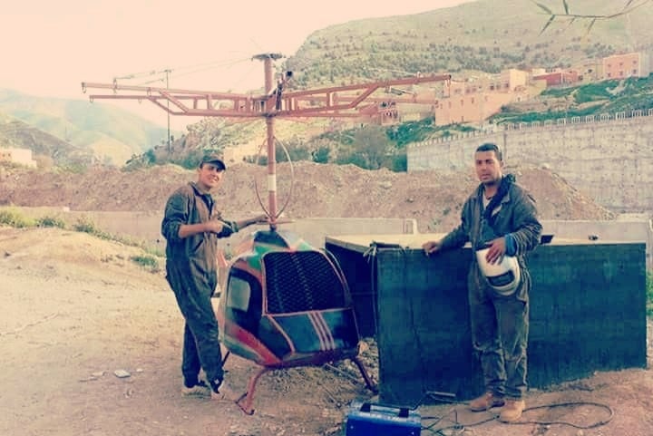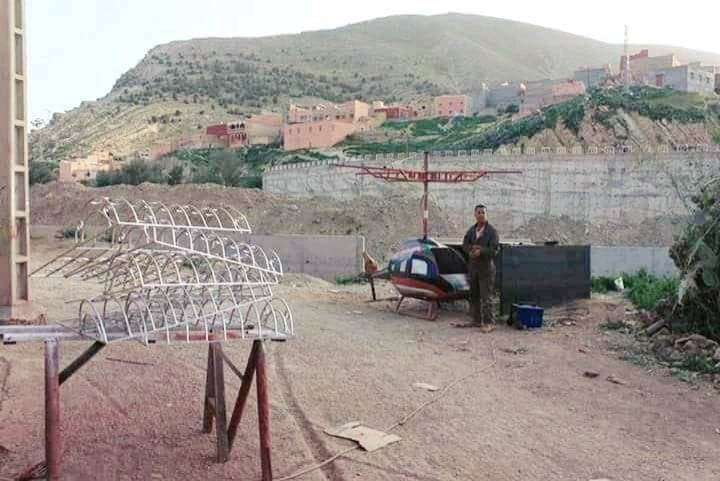 تداول فيسبوكيون ليلة امس، صورا مثيرة جدا، لشاب مغربي، قالت انه ينحدر من جماعة بزضاد، ضواحي الصويرة، تمكن بوسائل بسيطة من صناعة طائرة من صنف " هليكوبتر".