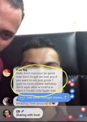 الشاب استغل بث رونالدو لفيديو مباشر على الفايسبوك ليلتمس منه في تعليق طريف أن "يعف" المنتخب بالاكتفاء بفوز صغير لا يتجاوز هدفا واحدا، مؤكدا له أن المغاربة يحبونه، وخاتما تعليقه بالقول:.."دخلنا عليك بوجه الله والملحة والطعام لي شركتي مع بدر هاري ".