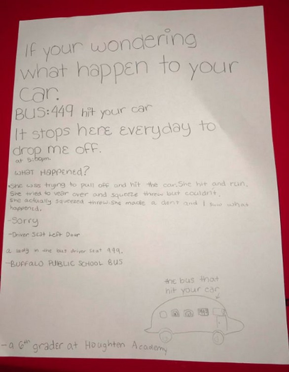 وتقول الرسالة "إذا كنت تتساءل عن الشخص الذي صدم سيارتك، فهي سائقة الحافلة رقم: 449، وهي تتوقف هنا كل يوم في الساعة 5:50 مساءً في طريق العودة، لقد كانت تحاول أن تتوقف على جانب الطريق فصدمت سيارتك، قبل أن تهرب من مكان الحادث".