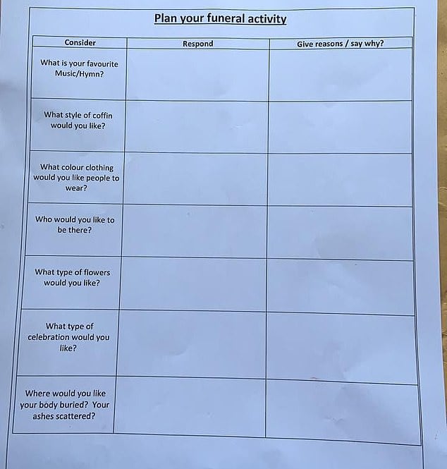 الأمر الذي شكل قلقاً وانزعاجاً شديداً لدى الآباء والأمهات، ودفع أحدهم بنشر صورة للواجب المدرسي عبر فيس بوك، الذي تضمن "أين تريد أن تدفن جثتك؟"، بالإضافة إلى أسئلة أخرى غريبة، تشمل الأشخاص الذين يتم دعوتهم للعزاء ونوع الملابس التي يتم ارتداؤها، وما إذا كانو يفضلون الدفن أم الحرق، حسب ما ورد في صحيفة دايلي ميل البريطانية.