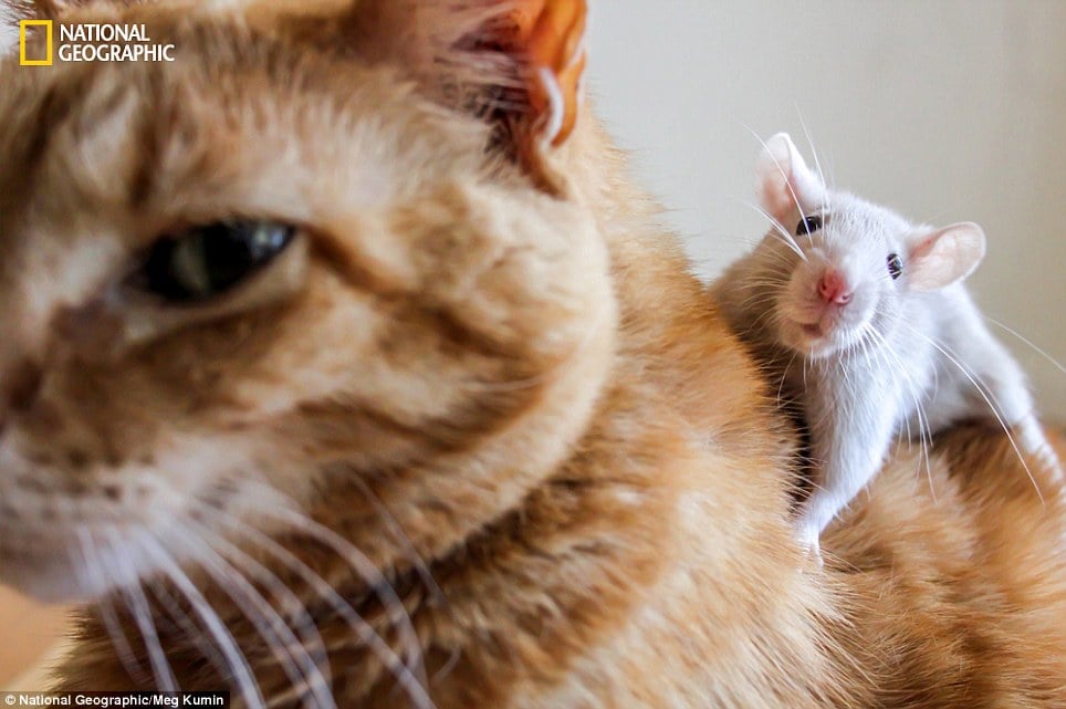 وتنوعت الصور مخترقة عالم الحيوان لتنتقل إلى مملكة الطيور، من خلال مجموعة متنوعة من المشاهد قلما نراها، أبرزها صورة التقطها “ميج كومين” لفأر يمتطى ظهر قط رغم العلاقة العدائية التي تجمع بينهما.