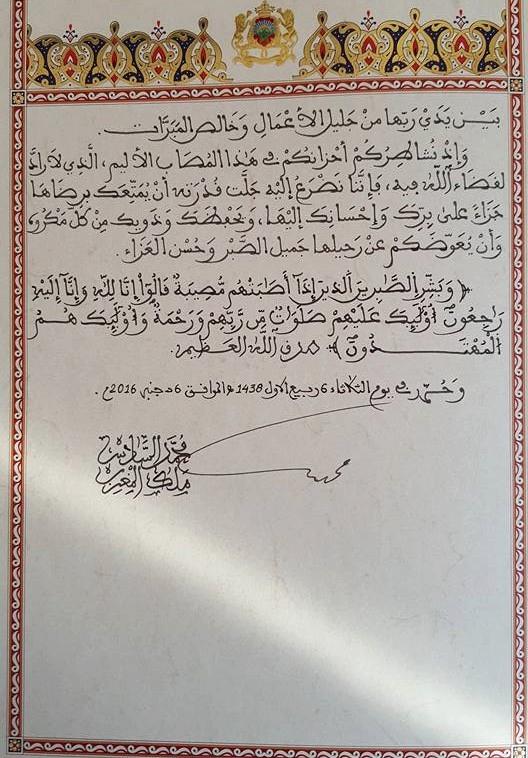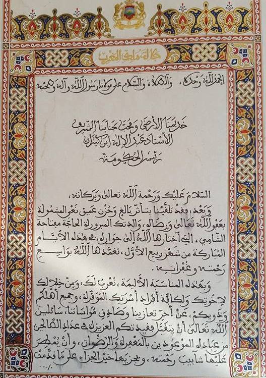 هذه صورة رسالة التعزية التي بعثها الملك لبنكيران بالخط العربي