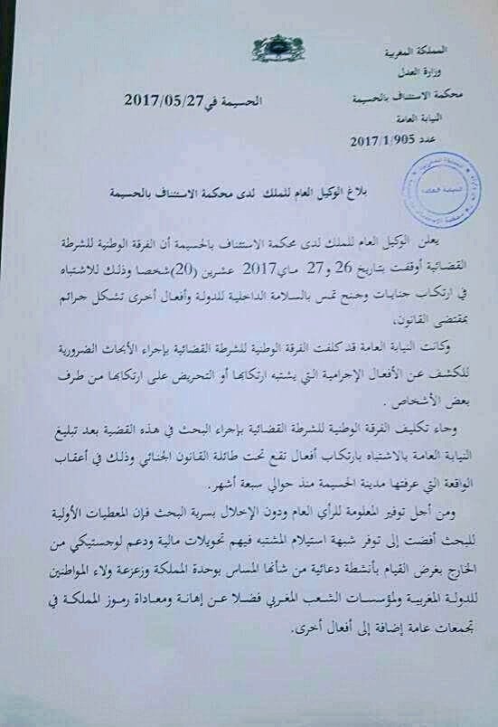 و أعلن الوكيل العام للملك لدى محكمة الاستئناف بالحسيمة أن الفرقة الوطنية للشرطة القضائية أوفقت بتاريخ 26 و27 ماي الجاري عشرين ( 20) شخصا، وذلك للاشتباه في ارتكاب جنايات وجنح تمس بالسلامة الداخلية للدولة وأفعال أخرى تشكل جرائم بمقتضى القانون.