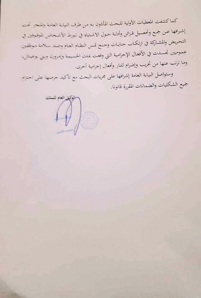 وذكر البلاغ أن المعطيات الأولية للبحث المأذون به من طرف النيابة العامة و المنجز تحت اشرافها، كشفت عن جمع وتحصيل قرائن وأدلة حول الاشتباه في تورط الأشخاص الموقوفين في التحريض والمشاركة في ارتكاب جنايات وجنح تمس النظام العام وضد سلامة موظفين عموميين تجسدت في الأفعال الاجرامية التي وقعت بمدن الحسيمة وامزورن وبني بوعياش وما ترتب عنها من تخريب وإضرام للنار وأفعال إجرامية أخرى.