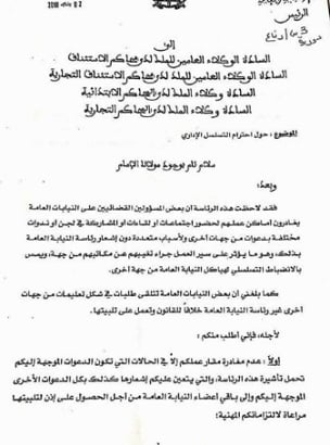 و حسب نص الوثيقة التي حصلت "أخبارنا المغربية" على نسخة منها، فانه وبداية من اليوم 02 يناير 2018 أصبح ممنوعاً على وكلاء المٓلك بجميع المحاكم الاستئنافية والاستئنافية التجارية و الادارية و الابتدائية، مغادرة مقرات عملهم بالمحاكم للمشاركة في لقاءات وندوات، والتغيب عن عملهم.