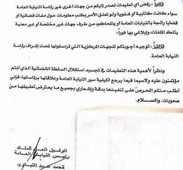 ودعت الدورية الصارمة وكلاء المٓلك الى رفض أي تعليمات من أي جهة كانت غير الصادرة عن رئيس النيابة العامة تجسيداً لاستقلال السلطة القضائية.