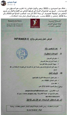 توصلنا في موقع " أخبارنا " بوثيقة صادرة عن الوكالة الوطنية لإنعاش الشغل والكفاءات، عبارة عن عرض عمل من أجل التعاقد مع 10 ممرضين للعمل بالمستوصفات القروية التابعة لإقليم فجيج، براتب شهري قدره 3000 درهم، الامر الذي طرحت معه علامات استفهام عريضة حول عزم الدولة نهج سياسة " التعاقد " على شاكلة ما جرى بقطاع التعليم، و القطع مع الوظيفة العمومية.
