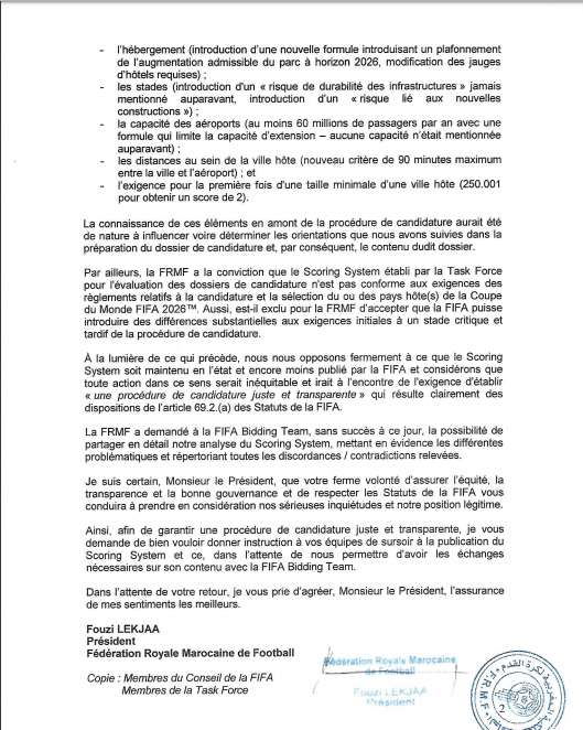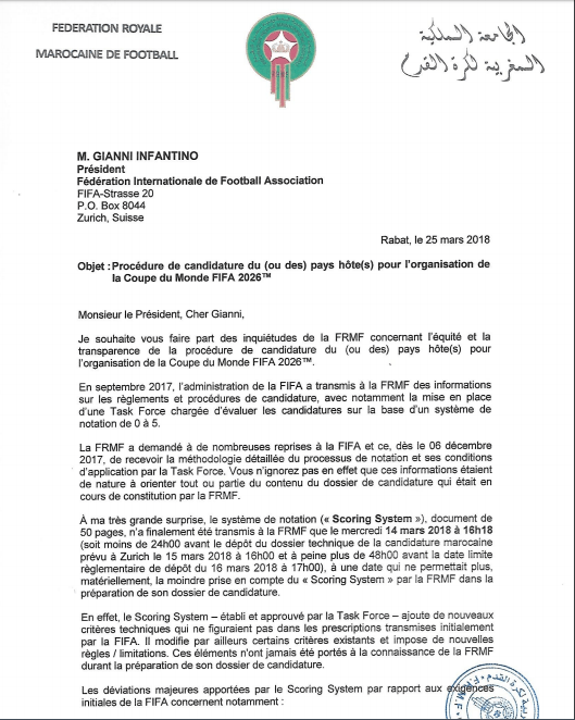 عث #المغرب المرشح لاستضافة #كأس_العالم في #كرة_القدم 2026، برسالة إلى الاتحاد الدولي (فيفا)، ينتقد فيها النظام الذي يعتمده الأخير لجهة التنقيط والمعايير التقنية التي سيتم على أساسها تقييم ملفات الترشيح.