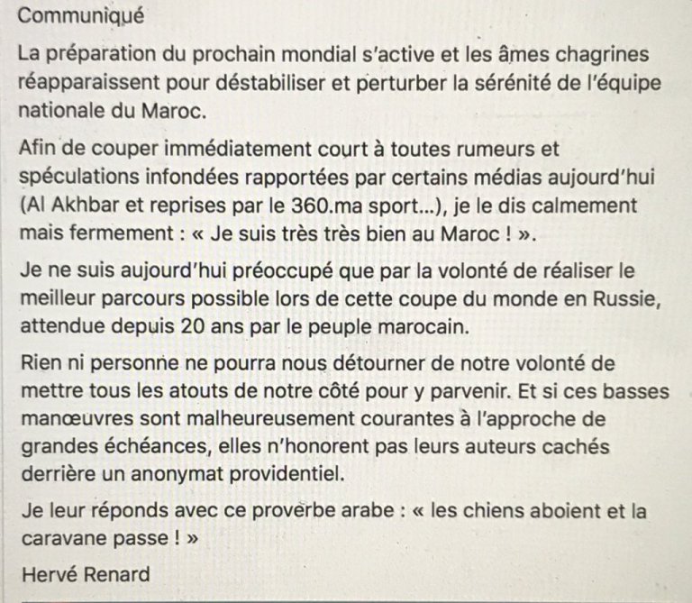 و قال رونار في بلاغ رسمي على حساباته الشخصية بمواقع التواصل الإجتماعي " البعض يريد استهداف إستقرار المنتخب المغربي من خلال هذه الإشاعة لأن المونديال إقترب".