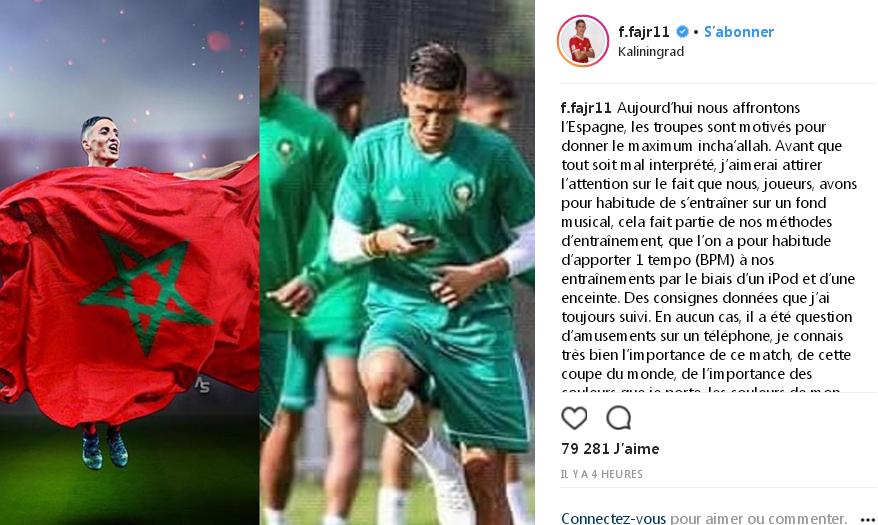 وأرفق فجر تدوينته بصورة مركبة ، الاولى رفقة العلم الوطني و الثانية تظهره ممسكا بالهاتف ، وهي الصورة التي خلقت الجدل على مواقع التواصل و جعلت الجماهير تهاجمه وتتهمه بالاستهتار.