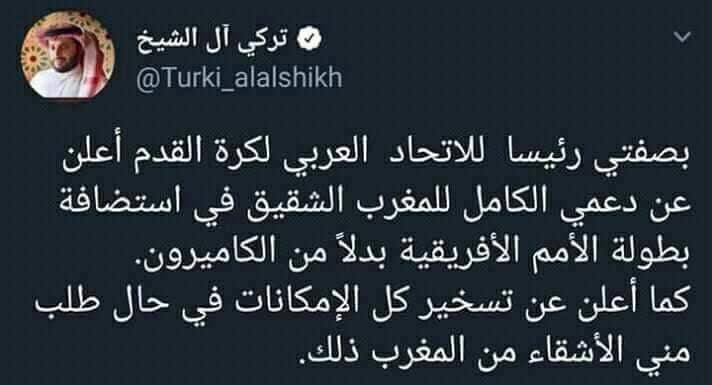 وكتب تركي آل الشيخ، على حسابه بموقع التواصل "تويتر":"بصفتي رئيسًا للاتحاد العربي لكرة القدم أعلن عن دعمي الكامل للمغرب الشقيق في استضافة بطولة الأمم الأفريقية بدلاً من الكاميرون، كما أعلن عن تسخير كل الإمكانات في حال طلب مني الأشقاء من المغرب ذلك".