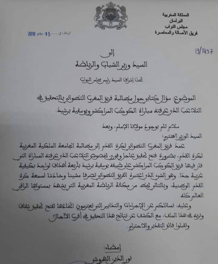 وأوضح النائب البرلماني ، في سؤال كتابي موجه إلى وزارة الشباب والرياضة، أن فريق المغرب التطواني لكرة القدم "عمد إلى مطالبة الجامعة الملكية المغربية لكرة القدم، بضرورة فتح تحقيق عاجل وفوري بخصوص التلاعب الذي عرفته المباراة التي فاز فيها فريق الكوكب المراكشي على ضيفه يوسفية برشيد بأربعة أهداف لواحد بكيفية غريبة جدا".