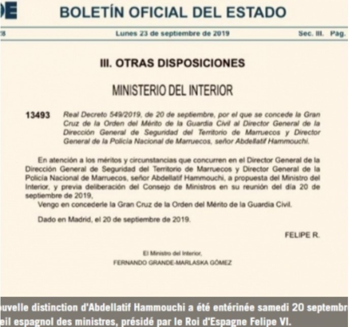 أكدت الجريدة الرسمية الإسبانية اليوم الاثنين أن الحكومة الإسبانية وشحت السيد عبد اللطيف الحموشي المدير العام للأمن الوطني والمدير العام لمراقبة التراب الوطني بوسام الصليب الأكبر للاستحقاق للحرس المدني .